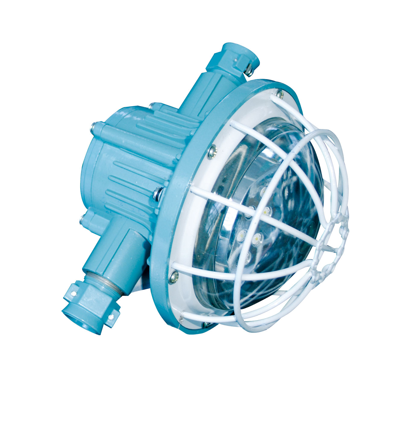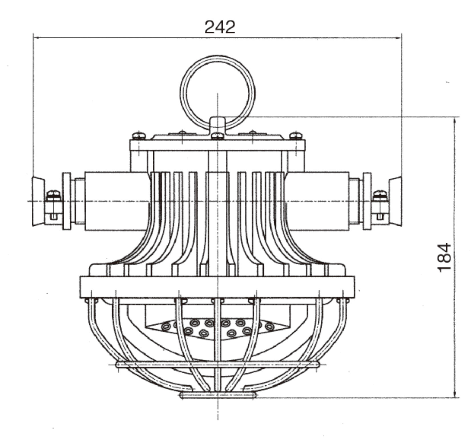 LED燈由上蓋、上殼體、下殼體、防爆透明玻璃罩、護罩等組成,上蓋與上殼體用M4螺釘連接,下殼體用M6螺釘與上殼體相連。防爆透明玻璃罩、護罩用M4螺釘固定在下殼體上。上殼體外有M4外接地螺釘、銘牌等。上殼體內(nèi)有接線板、M4內(nèi)接地螺釘、LED驅(qū)動電源板。下殼體內(nèi)有密封墊、防爆透明玻璃罩、LED光源、散熱板。散熱板通過上殼體將光源熱量散發(fā)到燈體外。上蓋、上殼體、下殼體、防爆透明玻璃罩之間均有符合規(guī)定的隔爆接合面隔爆。